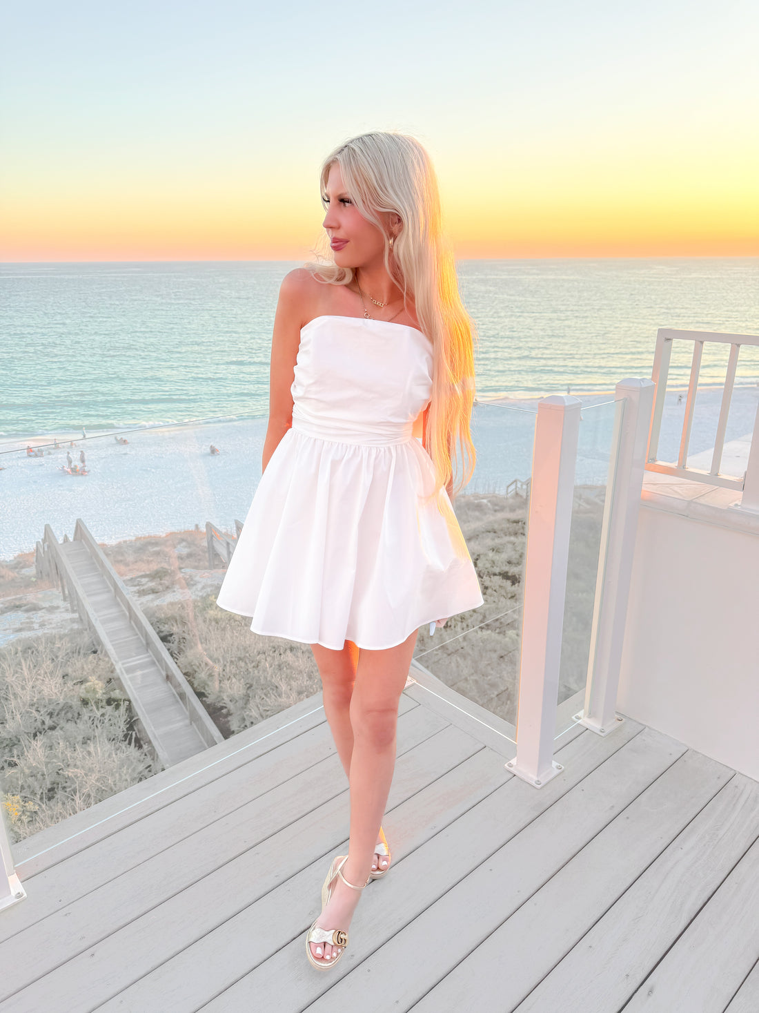 Meet the Jennifer Dress from Sassy Shortcake! This strapless white mini dress features a flattering silhouette and a charming back tie bow for a touch of playful elegance. Perfect for any special occasion, this dress is sure to turn heads.