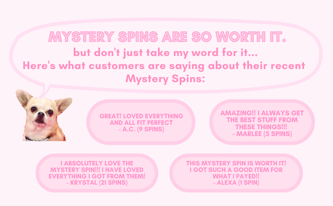MYSTERY SPINIt's that time of year again! We've stocked the bins with TONS of new pretties💖 Mystery spins will be clothing. You have the option to select your preferred size. Examples of mystery items are tops, bottoms, athletic wear, dresses, skirts, sweaters, shorts, and a few jackets.