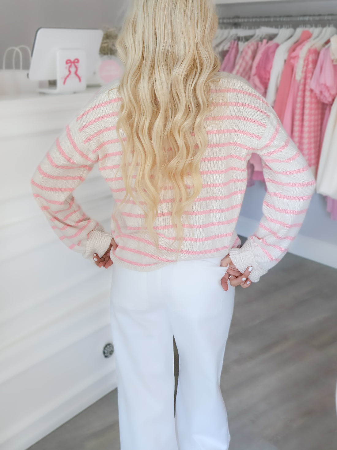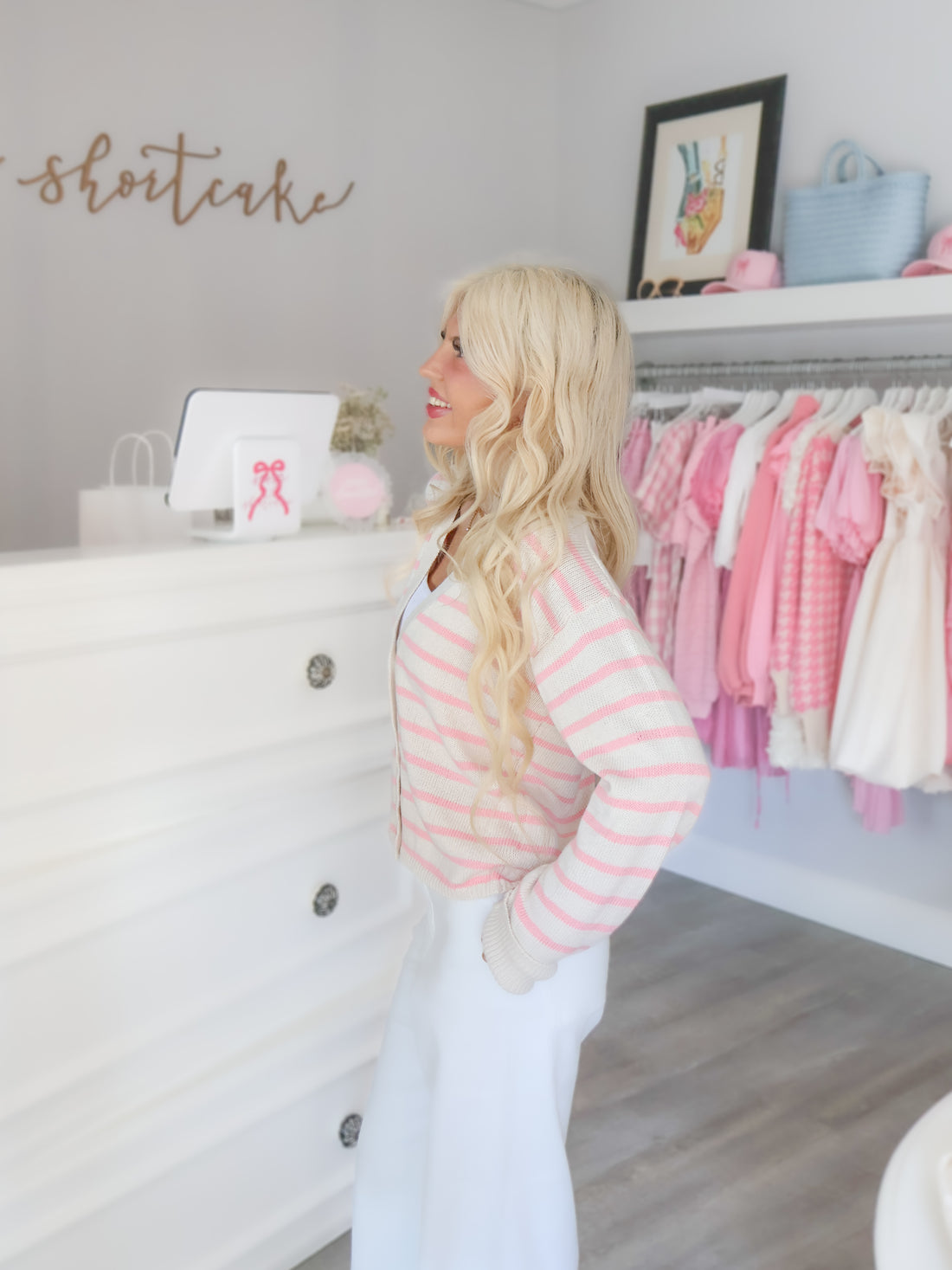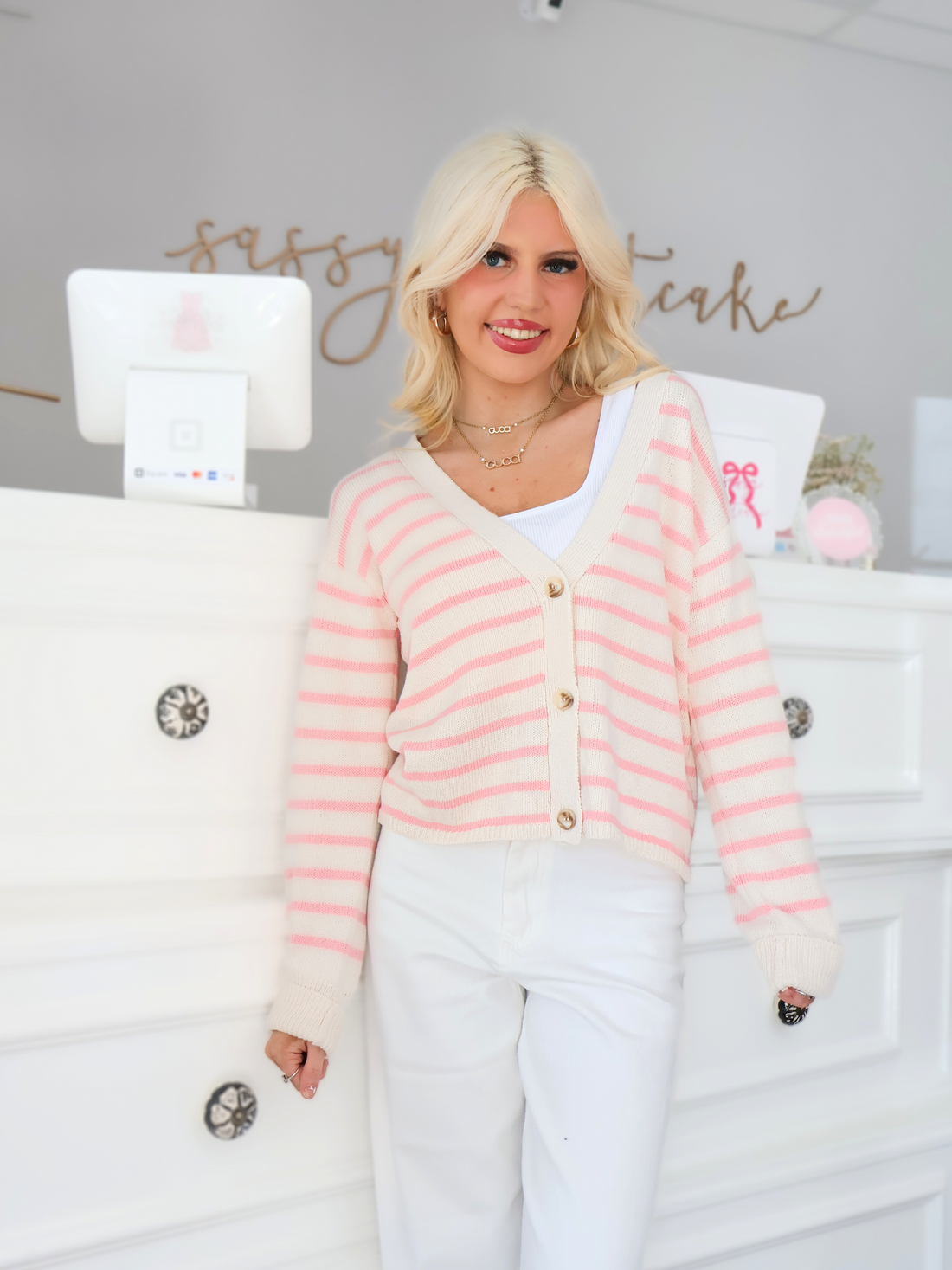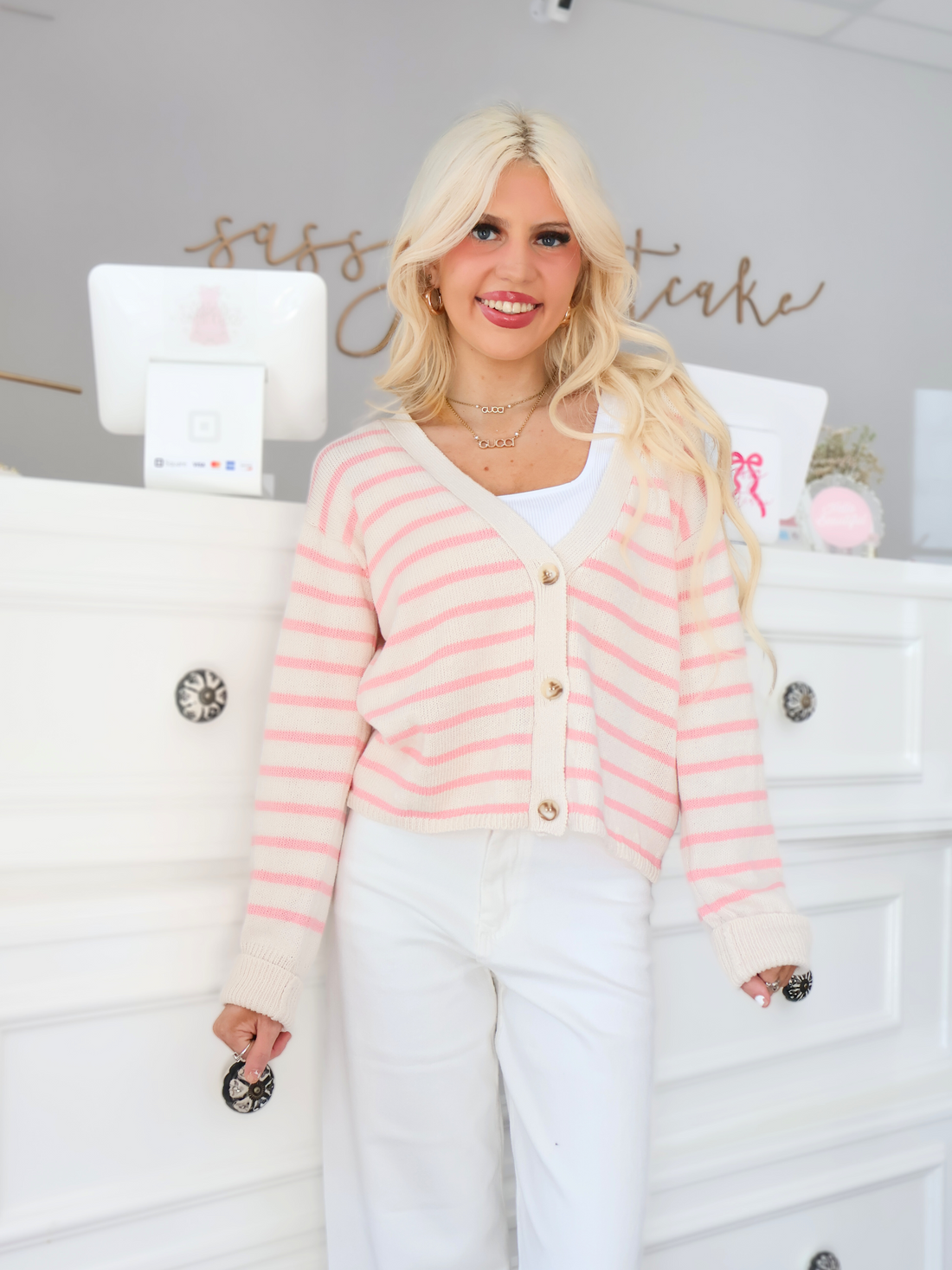 Add a touch of sweetness to your wardrobe with the Sugar Stripe Cardigan from Sassy Shortcake. This cozy cardigan features playful pink and cream stripes, an easy button-up front, and a relaxed fit that layers perfectly over your favorite tops. Lightweight yet warm, itβs the perfect piece for transitioning between seasons while keeping your look effortlessly chic.